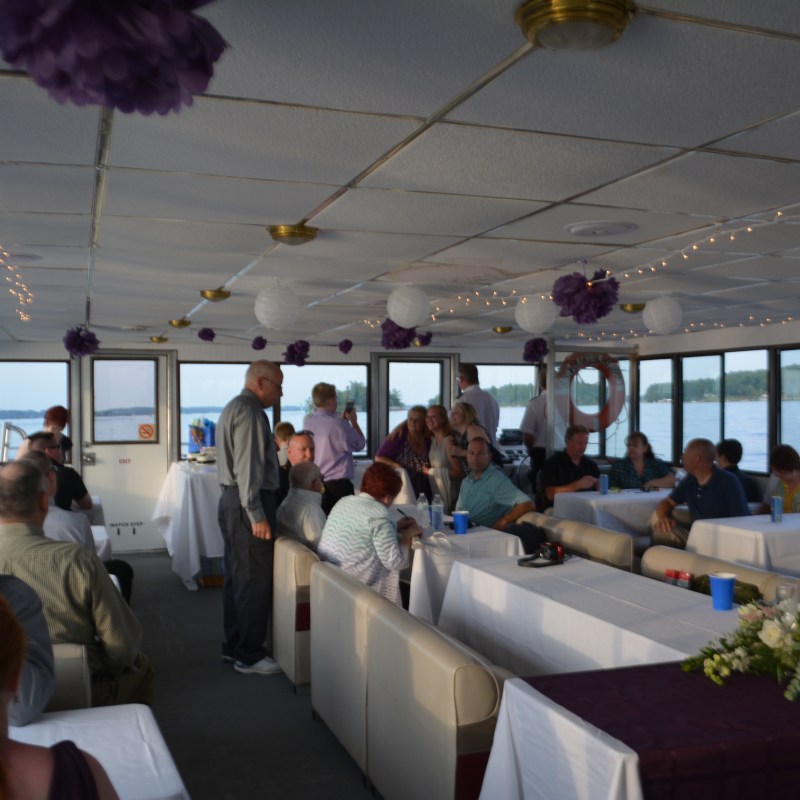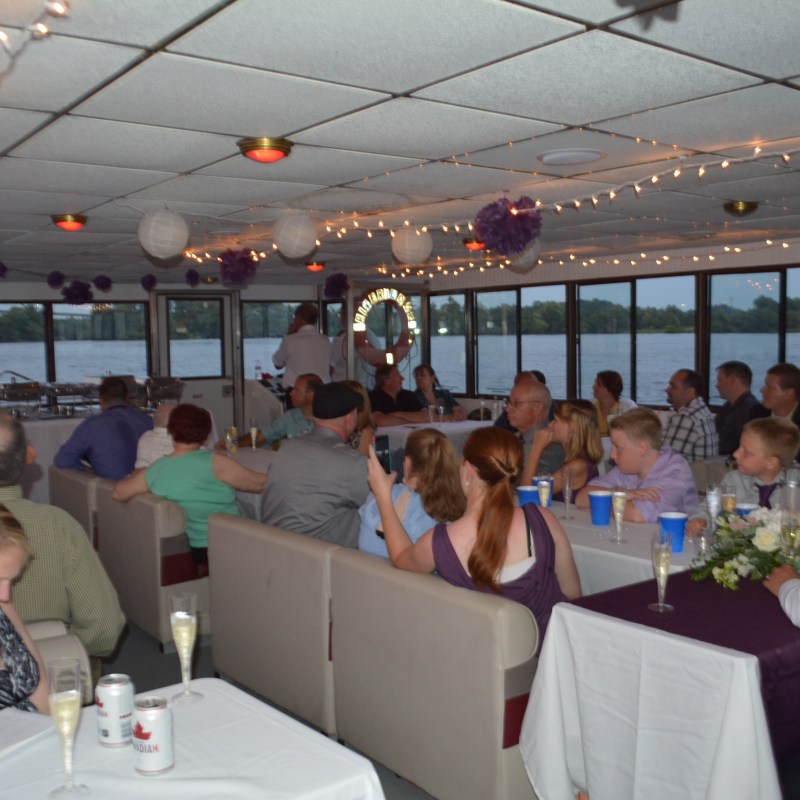 Make your important day that much more special, and impress your guests, with a floating scenic wedding aboard one of our boats on the St. Lawrence River – Sample: 2 Hour River Cruise, Captain performs the Ceremony, Event Planner, Music System, Narrator, Bride and Groom Gift, Cheese and Cracker Tray, Complimentary Water, all set up and clean up. Self Decorating s permitted.